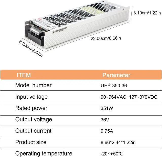 The MedInnov UHP-350-36 is a slim, 350W single-output industrial power supply designed for demanding applications. Its fanless design and high 94% efficiency ensure quiet, cool operation, while the wide operating temperature range (-22°F to 158°F) and robust construction make it suitable for various industrial environments. This power supply features active Power Factor Correction (PFC) and comprehensive protection against short circuits, overload, overvoltage, and overheating. The UHP-350-36 offers a reliable and efficient power solution for a wide range of industrial uses.