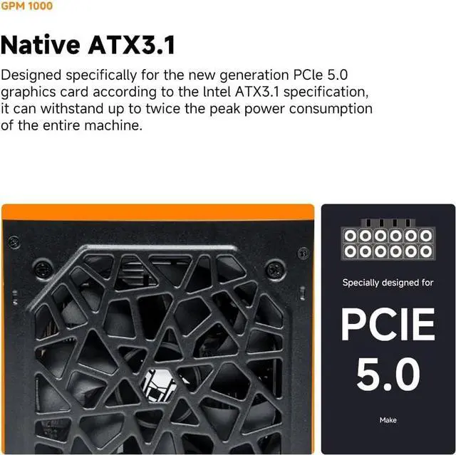 Native ATX 3.1: Passes Intel ATX 3.0 specification, specially built for the new generation of PCle 5.0 graphics cards, which can withstand up to two times the peak power consumption of the whole machine^^PCle 5.0 80PLUS