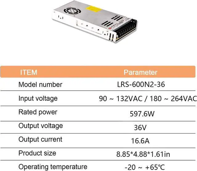 The MedInnov LRS-600N2-36 is a 597.6W single-output industrial power supply designed for demanding applications. It features a wide input voltage range (90-132VAC / 180-264VAC selectable via switch) and offers robust protection against short circuits, overloads, overvoltage, and overheating. The built-in forced air cooling system with fan on/off control ensures efficient heat dissipation, allowing for reliable operation even in high-temperature environments up to 149°F. This power supply is highly efficient (92%) and can withstand 5G vibration, making it suitable for a wide range of industrial applications. Its compliance with international safety standards ensures reliable and safe operation.