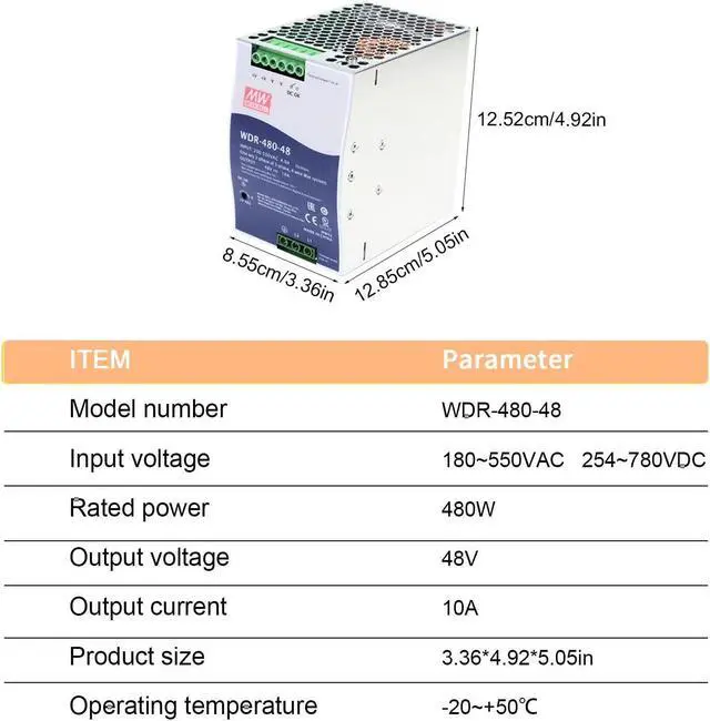 Reliable Power for Remote and Unstable Environments: WDR-480-48 48V/10A DIN Rail Power Supply Ensure consistent power delivery to your critical equipment in challenging locations with the WDR-480-48. This robust 480W power supply features a wide input voltage range and high efficiency, making it ideal for remote areas, unstable grids, and off-grid systems. Key Features for Demanding Applications: Uninterrupted Power in Unstable Grids: The ultra-wide input voltage range (180-550VAC) ensures reliable operation even in areas with fluctuating or unreliable power grids, minimizing downtime and protecting valuable equipment. Perfect for remote locations where stable grid power isn't available. Consistent Performance in Remote Locations: Delivering a stable 48V/10A output, the WDR-480-48 provides dependable power for essential equipment in remote or off-grid locations, where reliable power is crucial. Built for Harsh and Remote Environments: Designed for challenging conditions, the WDR-480-48 can handle temperature extremes and other harsh conditions often encountered in remote deployments, ensuring consistent performance and longevity. Remote Monitoring for Peace of Mind: The integrated DC OK relay enables remote monitoring of the power supply's status, providing valuable insights and allowing for proactive maintenance in remote or unattended installations. Efficient Operation Conserves Power: High efficiency (93%) minimizes power consumption, a critical factor in remote locations with limited power availability or for off-grid systems relying on batteries or alternative energy sources. Technical Specifications: Output Voltage: 48V DC Output Current: 10A Output Power: 480W Input Voltage: 180-550VAC Efficiency: 93% Mounting: DIN Rail DC OK Relay: Included Ensure reliable power, no matter the location. Order the WDR-480-48 today!