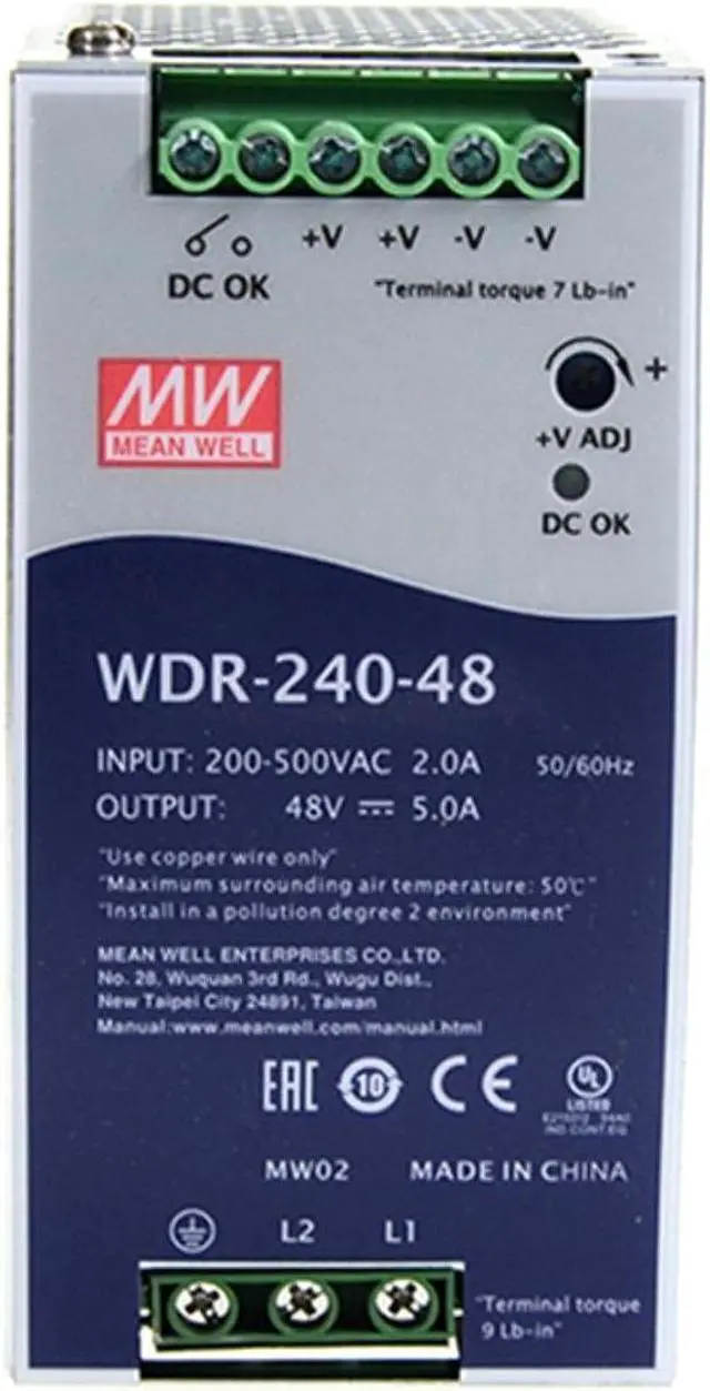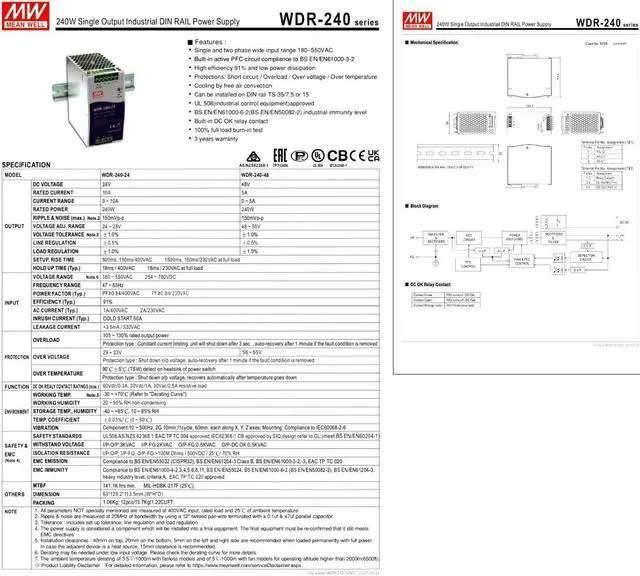 Reliable Power for Smart Buildings: WDR-240-48 48V Power Supply Ensure seamless operation of your building automation systems with the WDR-240-48, a stable and efficient 48V/5A (240W) power solution. Ideal for lighting control, HVAC, security, and access control systems, the WDR-240-48 delivers reliable performance you can depend on. Adaptable to Fluctuating Power: The wide input voltage range (180-550VAC or 254-780VDC) ensures consistent performance even with fluctuating power conditions common in building environments. Safety and Compliance: Designed to meet industry standards, the WDR-240-48 guarantees safe and reliable operation, contributing to a secure building environment. Long-Term Reliability & Reduced Costs: Built with high-quality components, the WDR-240-48 offers long-term reliability and minimal maintenance, reducing operational costs. Seamless Integration: DIN rail mounting (TS-35/7.5 or TS-35/15) simplifies installation and integration into existing building infrastructure. Choose the WDR-240-48 for: Stable and efficient power: Ensure reliable building automation. Wide input voltage: Adapts to fluctuating power conditions. Safety and compliance: Meets industry standards. Long-term reliability: Reduces maintenance and operational costs. Easy integration: Simplifies installation into building infrastructure.