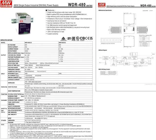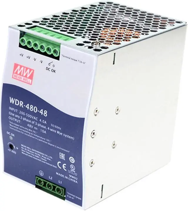 Boost Automation Performance with the WDR-480-48: A Reliable and Efficient 48V/10A DIN Rail Power Supply Power your automation equipment with confidence using the WDR-480-48, a high-performance 480W power supply designed for efficiency and reliability. Delivering a stable 48V DC output at 10A, this robust unit ensures consistent performance and helps maximize the lifespan of your valuable automation components. Key Benefits for Your Automation Systems: Efficient and Reliable 48V Power: The WDR-480-48 provides a stable and efficient 48V/10A output with an impressive 93% efficiency, minimizing energy waste and reducing operating costs. This reliable power delivery ensures consistent performance and extends the operational life of your equipment. Comprehensive Protection Safeguards Equipment: Built-in safeguards against short circuits, overload, overvoltage, and overtemperature protect your automation equipment from potential damage, ensuring long-term reliability and minimizing costly downtime. Maximize Equipment Lifespan: Consistent and reliable power, combined with comprehensive protection, contributes to a longer lifespan for your automation equipment, reducing maintenance and replacement expenses. Seamless System Integration: The compact design of the WDR-480-48 simplifies integration into automation systems and control cabinets, optimizing space utilization and streamlining system design. Quick and Easy DIN Rail Mounting: Save time and resources with the convenient DIN rail mounting design, allowing for quick and secure installation in your automation setup. Compatible with standard TS-35/7.5 or TS-35/15 DIN rails. Technical Specifications: Output Voltage: 48V DC Output Current: 10A Output Power: 480W Input Voltage: 180-550VAC Efficiency: 93% Mounting: DIN Rail (TS-35/7.5 or TS-35/15) Invest in reliable power for your automation equipment. Order the WDR-480-48 today!