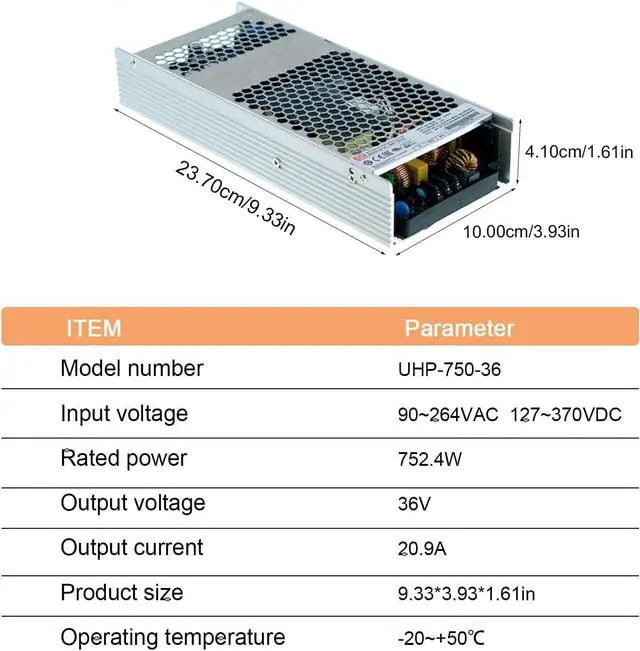 The MedInnov UHP-750-36 is a high-performance 752.4W industrial power supply designed for demanding applications. Its slim, 1.61-inch profile and fanless design make it ideal for space-constrained environments, while its 95% efficiency minimizes energy consumption and heat generation. The UHP-750-36 features a wide input voltage range (90-264VAC or 127-370VDC) and operates reliably in temperatures from -22°F to 158°F. Built-in protections against short circuits, overload, overvoltage, and overheating ensure long-lasting, reliable performance. This power supply is perfect for a variety of industrial applications, including automation machinery, control systems, electromechanical equipment, electronic instruments, and PoE power devices. The robust design and comprehensive safety certifications (UL62368-1, TUV BS EN/EN62368-1) make the UHP-750-36 a dependable choice for powering critical equipment.