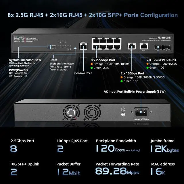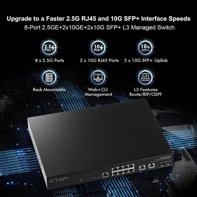 Ports: The network switch has 8 x 2.5G igabit Ethernet Ports, compliant IEEE 802.3 bz ( 2.5G ) standard, support 10/100/1000M/ 2.5G adaptive. ^^10Gbps Ports2x10G Ethernet Ports, backward compatible with 100M/1000M/ 2.5G /5Gbps rates, can be used as uplink port with higher aggregation bandwidth. 2x10G SFP+ optical port support standard module 10G/ 2.5G /1G adaptive, open standard SFP slot, support SR/LR/LRM/ER/ZR and other models (defalut without module) ^^L3/L2