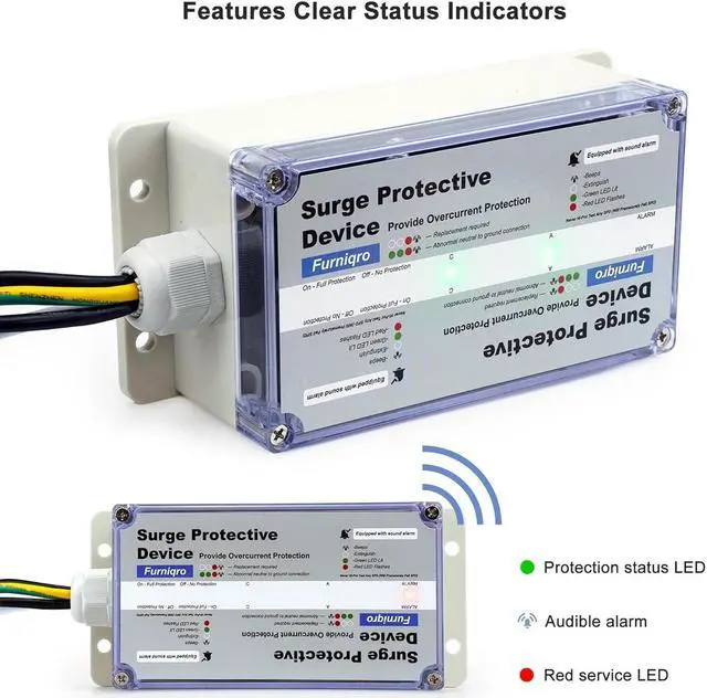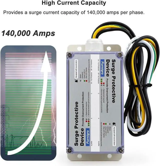 Line Voltage120/240 Split Phase, 50/60 HzSurge Spike Capacity140,000 AmpsAlarm methodBeeps and Red Service Light FlashesUL 1449 3rd Ed VPRL-N: 600 V, L-G: 600 V, N-G: 600 V, L-L: 900 VRated Voltage (MCOV)150V L-N, L-G, and N-G; 300V L-LResponse Time<1 nanosecondEnclosure Indoor and Outdoor RatedInstallation TypeChase NippleRecommended breaker size20 A Featuring a durable commercial-grade casing, it is suitable for both indoor and outdoor installation.