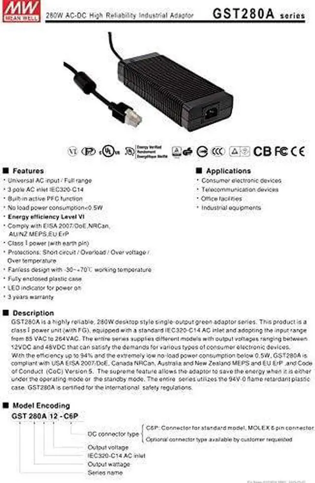 GST series of green energy-saving high-end enterprise level adapters can work continuously for a long time in 7x24 hours. Is widely used in IT, security, industrial control, LED lighting and other fields. Type A in line with European safety standards multi medium new. ^^Output 252W 12V 21A. ^^Original, We can check the serial number on the meanwell website. ^^We don't believe in cheap and cheerful. Reasonable price to ensure quality and service. Buy it now, save time, save life. ^^This item will ship GST280A12-C6P*1pcs, enjoy shopping and best wishes!