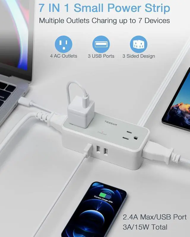 Extension Cord with Multiple Outlets: 4 outlets 3 USB charge up to 7 devices at the same time, ideal for computer, laptop, fan, cell phone, tablet, etc