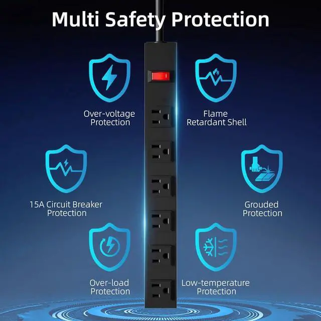OVERLOAD PROTECTION: A power switch with lighting has a built-in high quality 15A circuit breaker for overload protection. When the operating current exceeds the rated current, this power strip automatically cuts off the power supply from spikes, fires or other unsafe conditions.