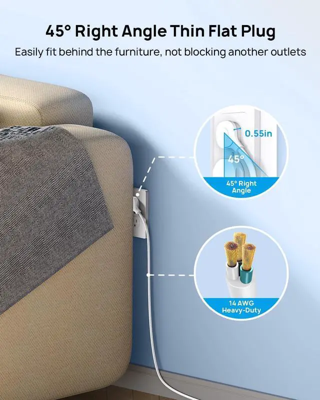 Flat Plug Power StripOur heavy-duty power strip with a 0.55 in low profile flat plug easily fits behind furniture close to the wall, and the 45° angle flat plug won' t block the bottom outlet, so you can make full use of wall plugs in your home. The 5ft extension cord is made of 14AWG pure copper wire, providing more current carrying capacity (15A)