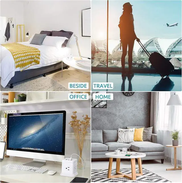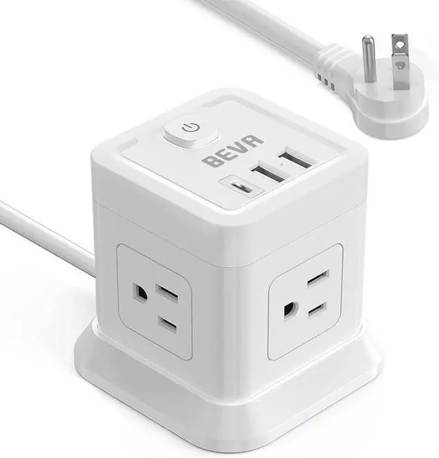 7-IN-1 Cube Power StripThe USB tower is equipped with 4 AC outlets and 3 USB charging ports in different directions to make full use of USB outlet. Provide power for up to 7 devices at the same time and all side outlet is designed for large adapters to charge without blocking each other, save your space and keep your desktop organized. You can charge your phone, lamp, laptop and other devices together.