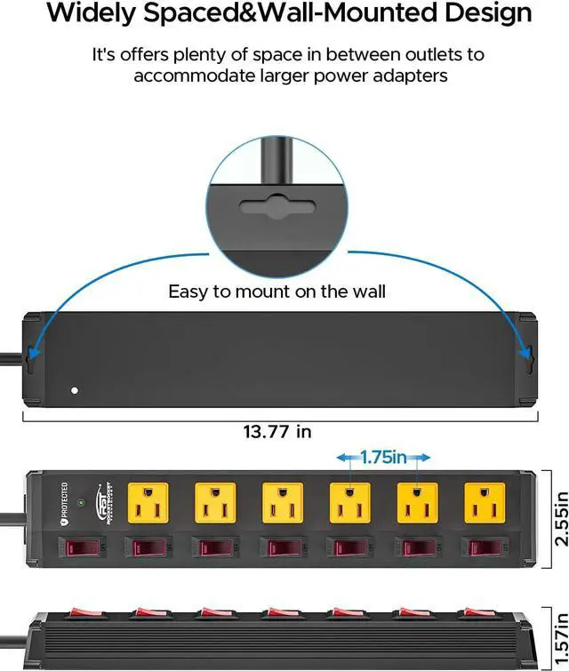 [Individual Switches & Wide Spaced] This heavy duty power strip is equipped with 6 individual switches and one master switch, offering you the freedom to control each device separately, which is both energy-saving and cost-effective. The outlets feature a generous 1.77 -inch wide spacing, designed to accommodate plugs of all sizes, preventing blockage issues. You can effortlessly use multiple bulky adaptor plugs at the same time without the need to frequently plug or unplug, greatly enhancing convenience and operational efficiency.