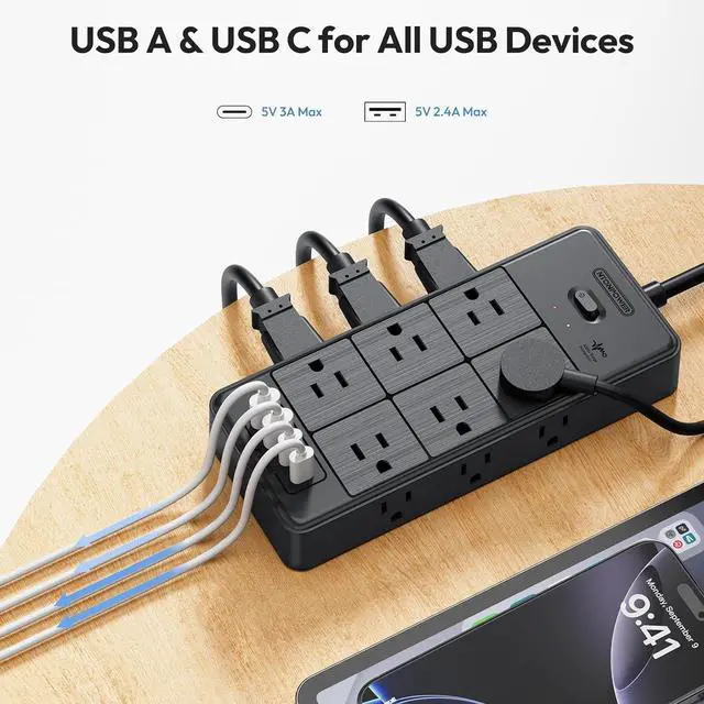 2 USB C & 2 USB A Ports Extension Cord- The power strip with 4 USB ports gives you more charging convenience and options, perfect for mobile phones, tablets, headphones, and other USB devices. No need for additional adapters anymore. The USB-C port is 5V/ 3.0A max and the USB-A port is 5V/ 2.4A max.