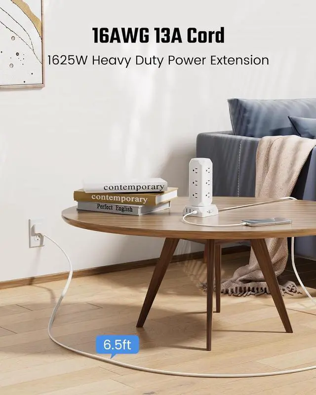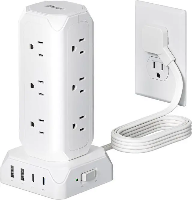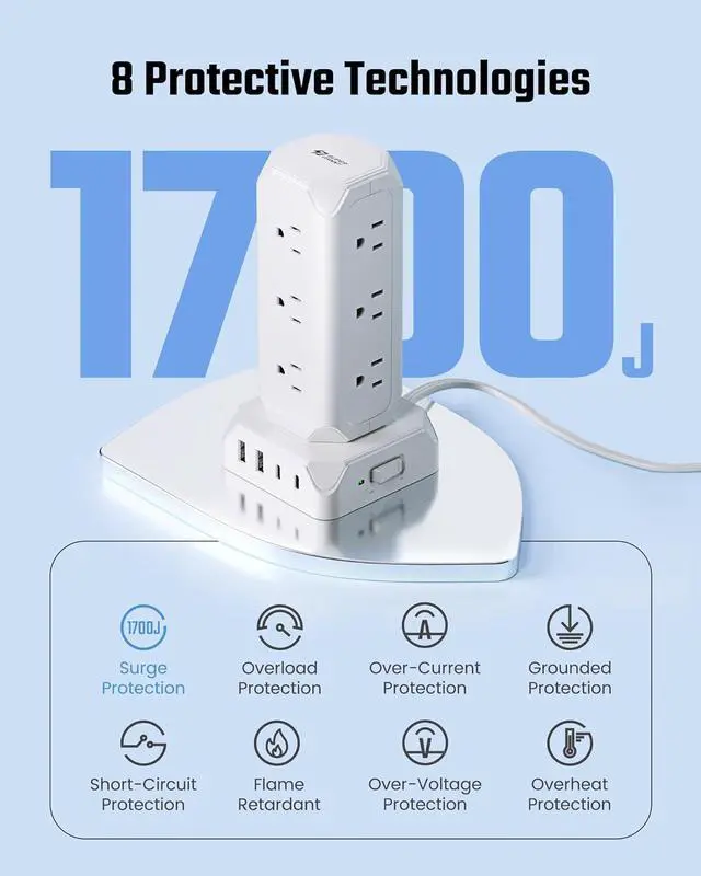 1700J Surge Protector: Inbuilt with high capacity surge-protecting units, the power strip tower filters the unexpected electrical surges from the power supply, protecting the electronics you plug into it.
