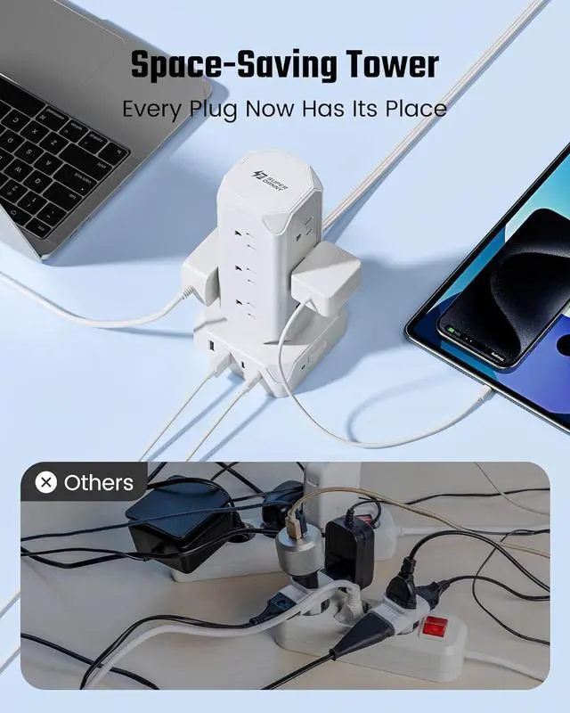 Worry-Free Power Solution: This vertical power strip surge protector is encased with fire-retardant material PC/ABS, ranked V-0, the highest fire-retardant rating. And the integrated power management chip protects against overloads, short-circuits, overheats, over-charging, etc. Backed with a 1-year manufacturer warranty and lifetime tech support, SUPERDANNY offers you peace-of-mind power solutions.