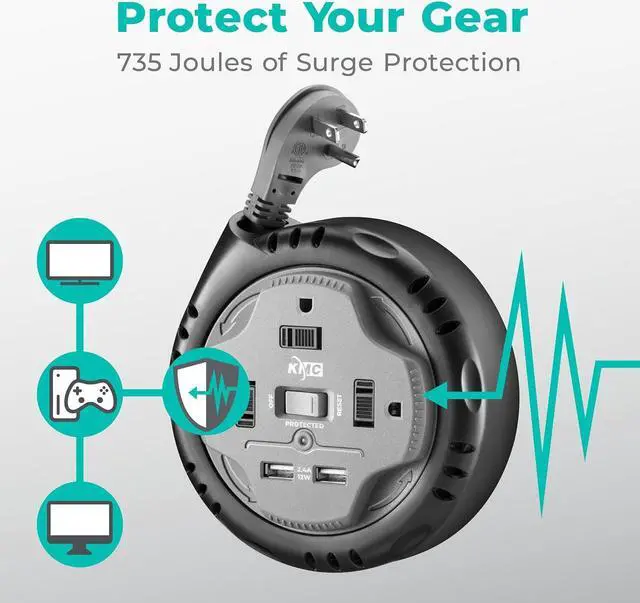 CONVENIENT: This self-contained and portable surge protector features a 5-foot 16/3 retractable extension cord that you can twist into the internal cord reel. The durable PVC cord has a low-profile plug to easily fit behind furniture.