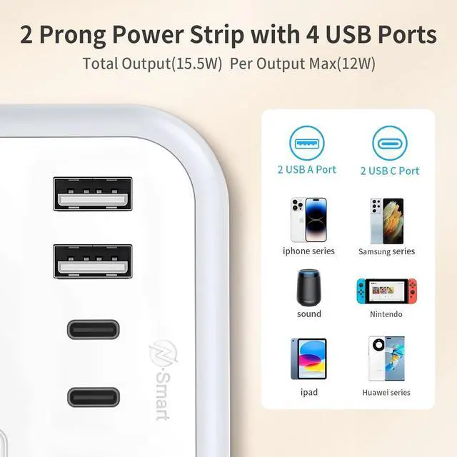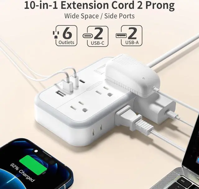 10-in-1 Two Prong to Three Prong Outlet AdapterToo many things that need sockets and not enough sockets? NTONPOWER two prong power strip with 6 AC ports and 4 USB ports (2 USB C ports) will automatically detect devices and provide optimal charging current for up to 10 devices at the same time.