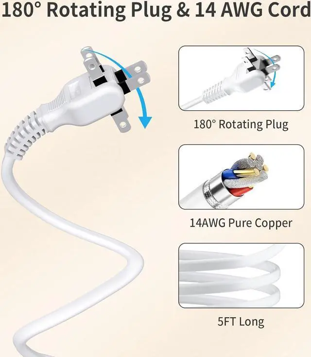 180 Degree Rotating Flat PlugThe flexible plug swivels freely without blocking other plugs on the socket and is easily concealed behind sofas or cabinets, saving a lot of space. The 2 prong extension cord supports wall mounting and greatly reduces the clutter of wires on the table.