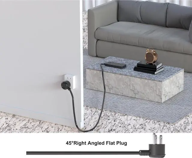 Mountable and Flat Plug ExtensionThe multiple plug outlet features two keyhole slots on the back and two hanging holes on the top, making it easy to mount this flat extension cord onto the wall or furniture. The 45° angled flat plugs are perfectly suited for narrow spaces, such as behind a bookshelf, nightstand, or TV. This extension cord provides multiple outlets for your convenience.