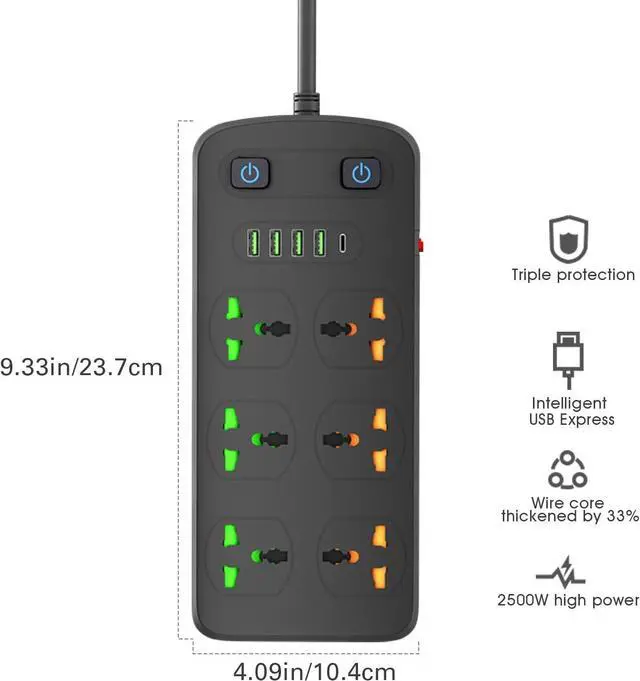 On/Off Switch: The universal power strip desktop is made of fire-resistant ABS+PC shell to protect from overload, short circuit, and overheating. It has a 6.5 ft long heavy-duty extension cord and two on/off switch for each 3 outlets for overload protection.
