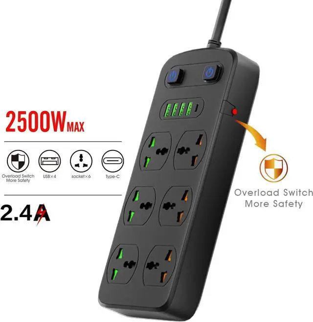 Multi-charging Universal Extension Lead: This power strip includes 6 widely spaced AC outlets, 4 USB ports and 1 USB Type C Charging Port. With 2500W of power, you can use it to charge for your cellphone, tablet, laptop and lamp simultaneously.