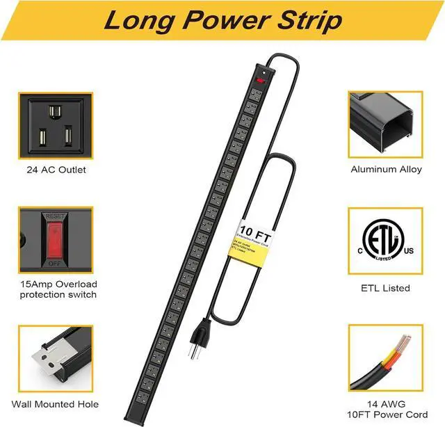 OUTLETS LONG POWER STRIP: 24 right angle AC outlets, Equipped with 10 ft Ultra Long grounded power cord (SJT 14AWG/3C), 60Hz/125V/15Amp/1875W. The slim and smooth design with multiple outlets, meets your demand to charge many devices simultaneously.