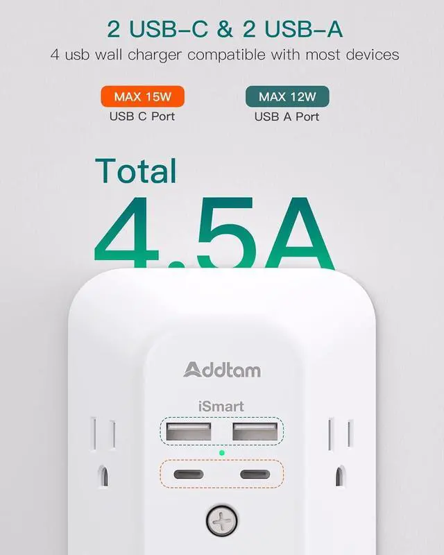 2 USB- C Fast & Smart Charge- 4 USB ports total 4.5 A, each USB A port features 2.4A Max output. USB C charging port features 3A MAX. Built- with smart technology, detecting charging devices and deliver optimal charging speed automatically, compatible with most USB devices.