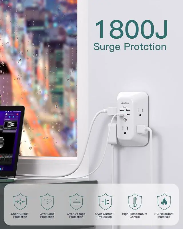 1800J Surge Protector Outlet- 3 complementary Surge Protection Circuits, TVS (transient voltage suppressor) MOV (metal oxide varistor) GDT (gas discharge tube), with response speed less than 1Ns, and minimum energy-absorbing capacity of 1800 Joules, much more quickly and reliably than the traditional MOV surge protector circuit. (" SURGE PROTECTED" indicator light on to show your devices are protected)