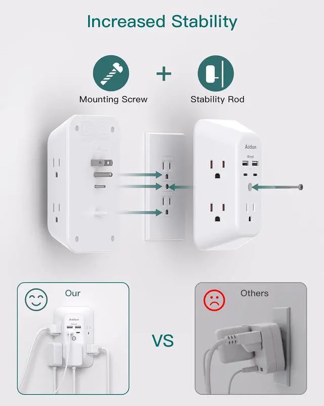 Double Stability & Wide Space- The screw included can be used to secure it on duplex outlet. The plastic prong at the back is for stable purposes also. For USB receptacle and GFCI outlet, the plastic prong needs to be cut off before use. 3-sided design and 1.7 inches large space between 5 sockets make it easier to use for all kinds of equipment