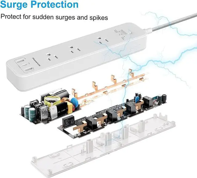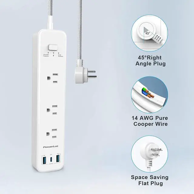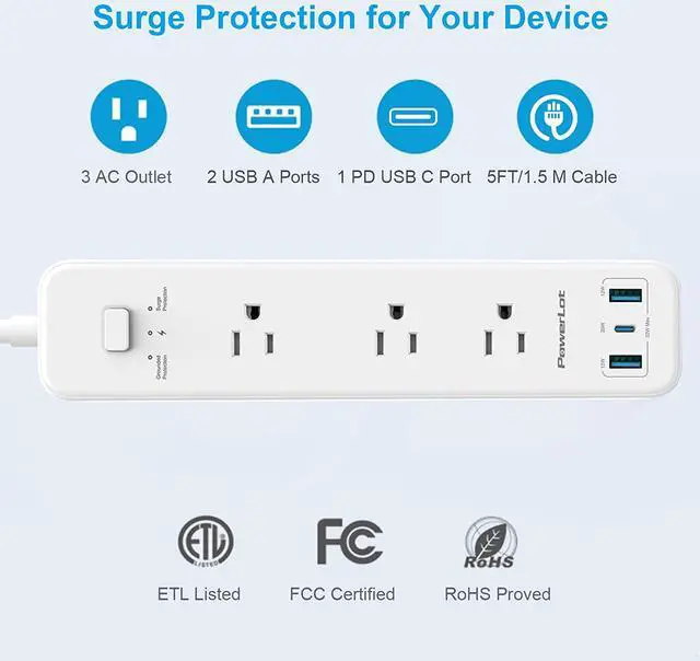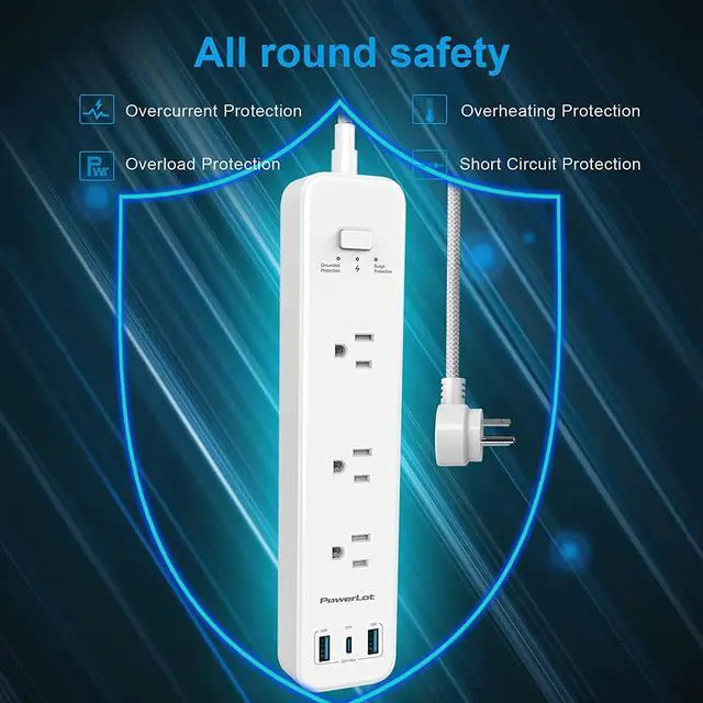 [All Round Safety] PowerLot Surge Protector Power Strip certificated by FCC, ETL and UL listed, with built in safe guards to protect both the power strip and your charging devices form over-heat, over-charge, over-current, and short circuit; 3 LED indicators to show power, surge protection, and grounding, always ensures a safe working condition for PowerLot customer