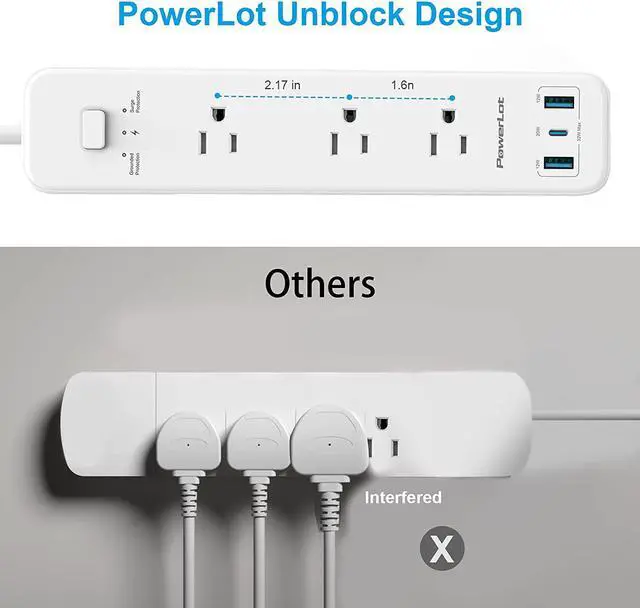 [Widest AC Space & Flat Plug] PowerLot power strip designed with wide space between each AC outlets, while a flat plug could be hind behind a furniture and would not block your other wall outlets, so that our customer would never be annoyed by plug interference