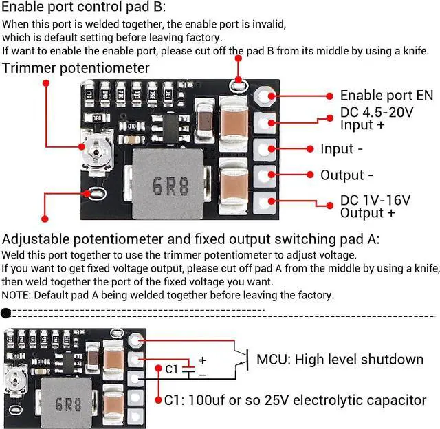 Output Voltage Adjustable or Fixable --- The tiny buck converter board can be changed to adjustable output voltage or a fixed one. The reducer is default to be used for adjustable voltage output. If you want to get fixed voltage output, you need to cut off the Pad A by using a sharp thing such as a knife, then weld together the port of the fixed voltage you want.
