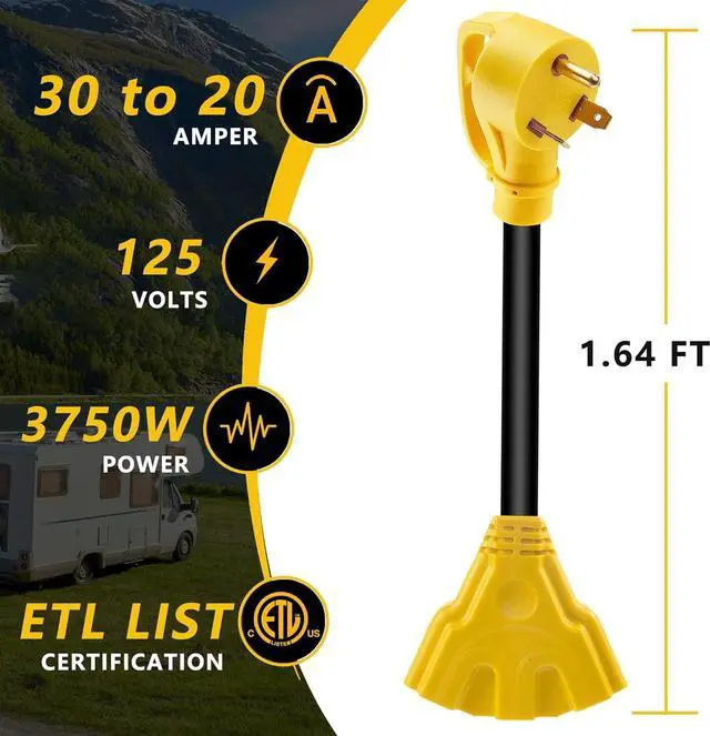 Product Feature: The 30 amp to 20 amp generator extension adapter are used to most household tools and electrical appliances, very suitable for distributes temporary power at job site or campsite