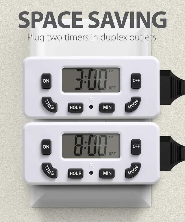 [SPACE SAVING] The outlet timer only occupies one socket. You are able to use two timers in duplex outlets, or leave the neighboring socket available for other devices. The low profile, side-entry plug design makes the timer fit behind furniture or in other hard-to-reach areas.