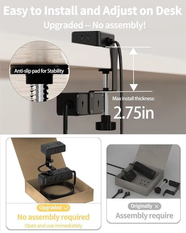 No Assembly Required: This dual layer desk power strip has no assembly requirements. No drilling or extra tools required. Simply clip the clamp power strip to your desk, twist to hold it in place, and adjust to the thickness of your desk. (Maximum adjustable table thickness: 2.75 in)