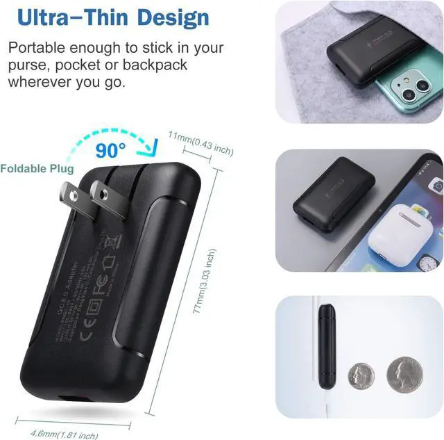 [Built in powerful GaN (Gallium Nitride) ]: GaN technology intelligent integrated circuit can provide great power in smart chip, reduce heat loss. Over-current, over-voltage, short-circuit, over-charge and over-temperature protection system ensure safe and fast charging to your devices. The robust and fireproof PC case makes this charger block feature with anti-fall, anti-scratch and anti-collision, making the flat phone charger more durable.
