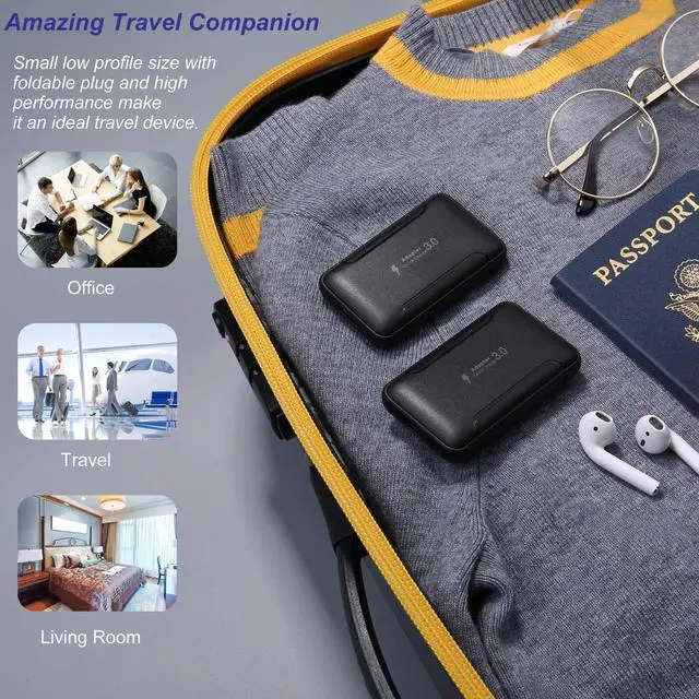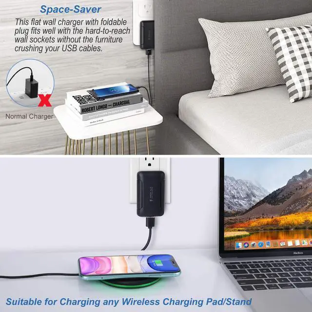 [Space Saver]: The incredibly thin USB wall charger is perfect for use in tiny spaces! Only 0.43 inches thick, the charger with foldable plug can easily fit into tight spaces between couches, headboards or other furniture and walls, protecting your charging cables from kicks or damage, keeping your home nice and tidy.