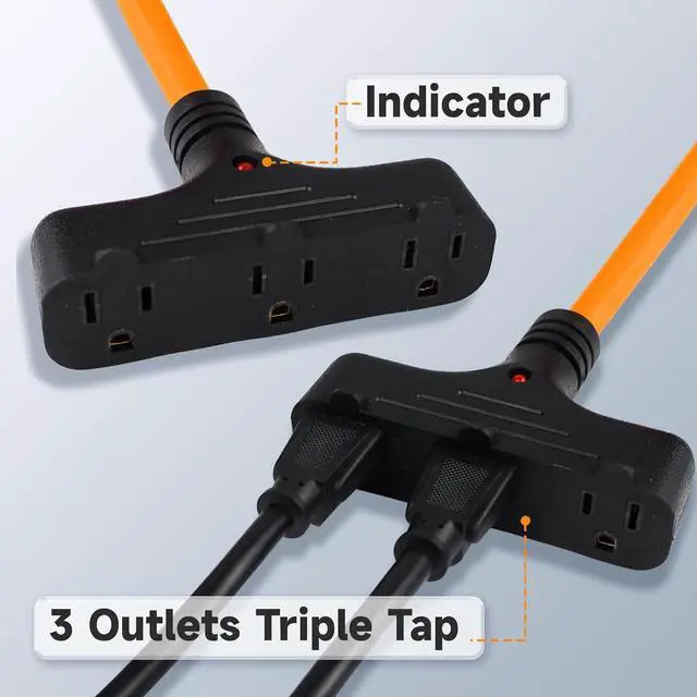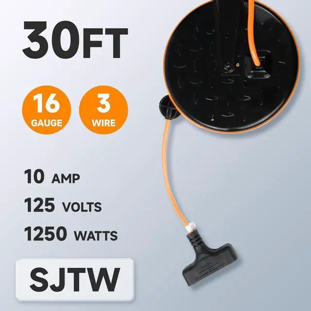 30 Ft 16/3C Gauge Power Cord - The length of the extension cord reel is 30ft. It can support up to three devices working at the same time and is more durable. Maximum power rating is 125V/1250W/60HZ.