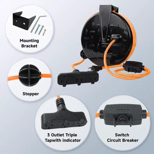 Automatic Retractable - The power cord reel can retract quickly and smoothly through the automatic guide rewind mechanism, and the ratchet system can lock any length of rope.