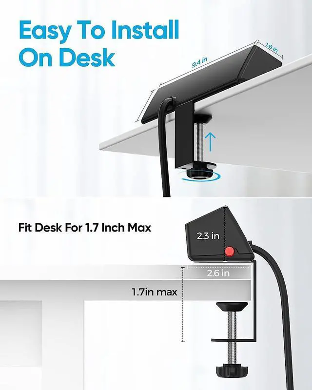 Easy To Install Desktop power strip surge protector with usb ports is very easy to mount, you don' t need to drill holes, just fix the clamp to the table and turn the button at the bottom. The 45° flat plug can be hidden behind furniture without blocking bottom socket.