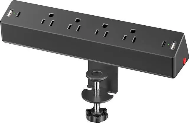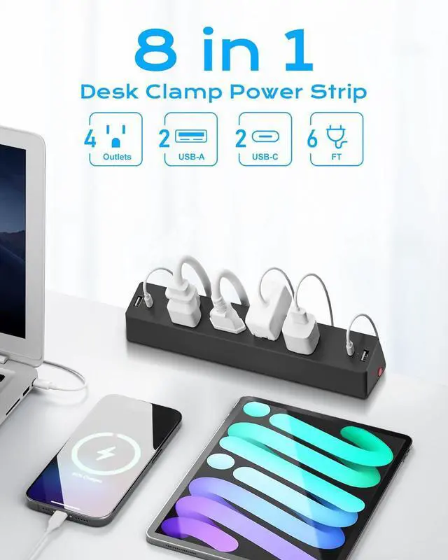 8-in-1 Desk Clamp Power Strip With 4 AC outlets 2 USB-A ports and 2 USB-C ports, Desk power strip can power up to 8 devices simultaneously.