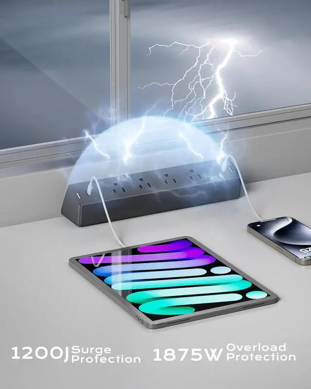 Desk Outlet Charging StationDesk power station is made of 1382°F heat-retardant material. It provide 1875W overload protection (the red button on the side) and 1200J surge protector.