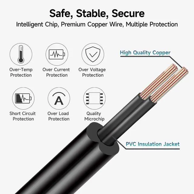 Built-in multi-Protections: Over-current Protection, Over-temperature Protection, Over-voltage Protection, Short-circuit Protection, Electromagnetic Wave Protection, it protects your devices well for safe and stable charging.
