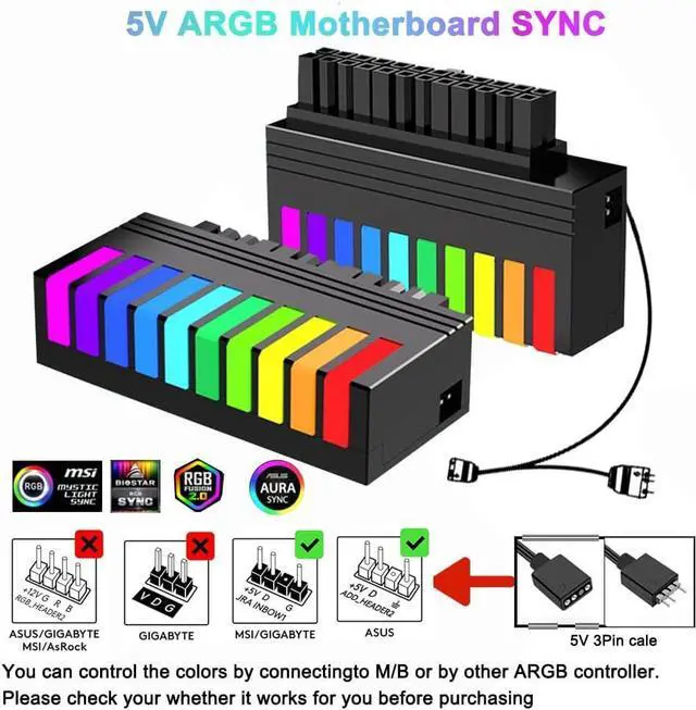 ATX 24 Pin 90 Degree Adapter, 5V 3PIN ARGB RGB 24Pin Right Angle ATX Female to Male Power Supply Adapter for 24PIN Motherboard (Black)