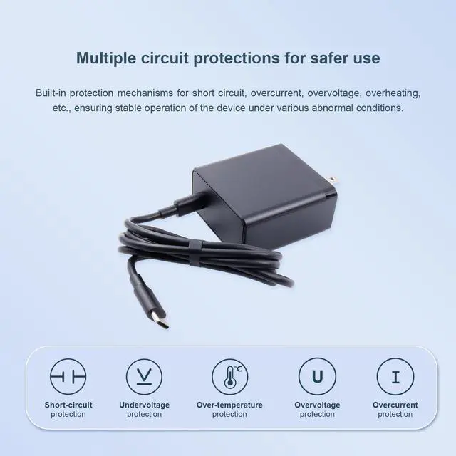 [Multiple Safety Protections]: The power adapter is equipped with comprehensive safety features, including input overvoltage protection, output overvoltage protection, short circuit protection, and overcurrent protection, safeguarding both your device and the adapter from potential damage.