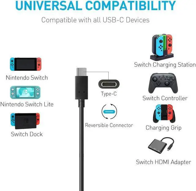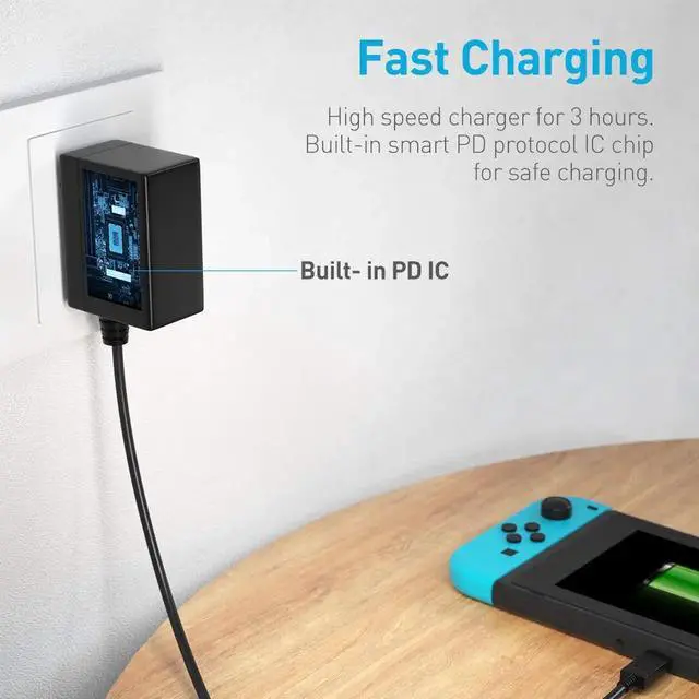 Designed with PD protocol IC chip, offering over voltage protection, over currentg protection, over temperature protection, and short circuit protection. Safely charger your Switch console, Switch dock, Switch Pro controller and many other devices with USB-C port.