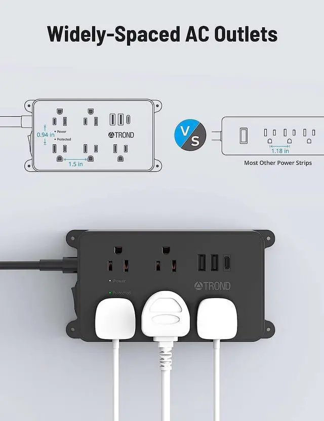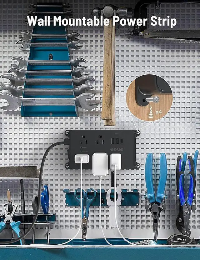 Wall Mountable Power Strip: This wall mount power strip is a screw mountable design. Four screw-mounting tabs allow you to securely install this power strip and easily be reached, including behind the TV, workbench, garage, bedside, bathroom, laundry room, or under desk or cabinet, which is very low-profile and saves desktop space for you