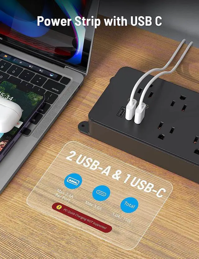 Power Strip: This surge protector turns a regular wall outlet into 5 grounded AC outlets plus 3 USB charging ports (1 USB C), which provides power and charging for up to 8 devices.