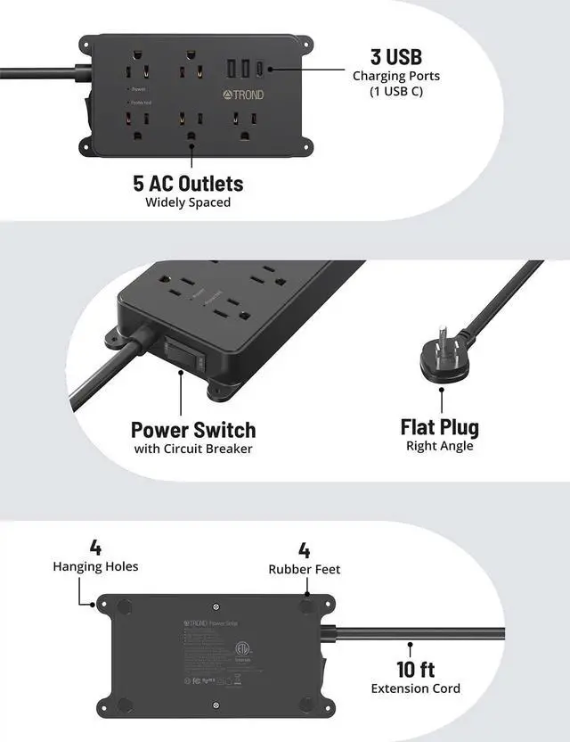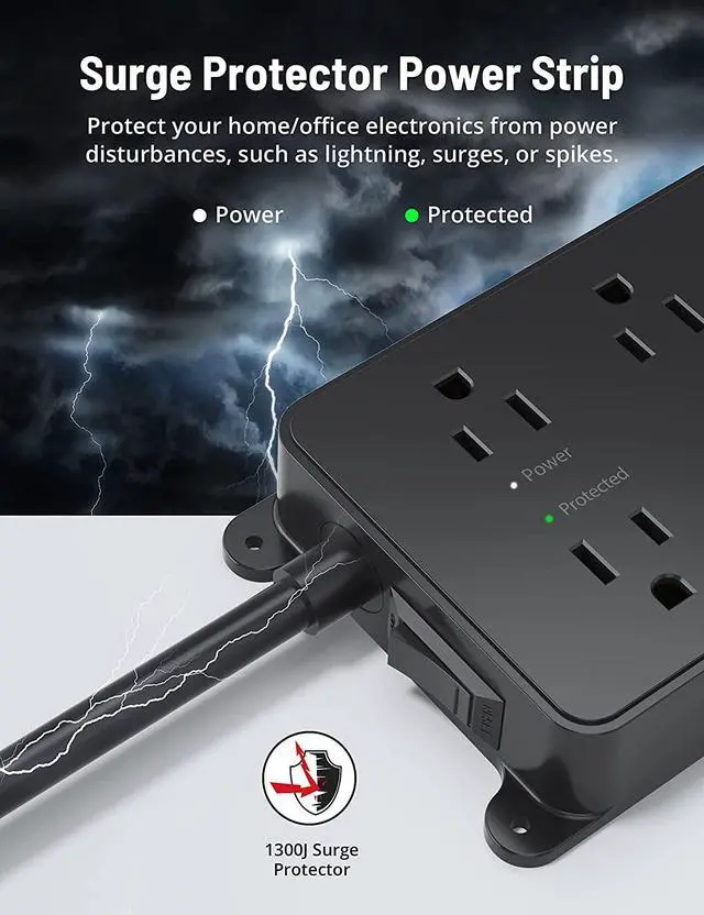 Safety Assurance: This power strip is ETL listed, and made of the top-grade UL94 V-0 flame-retardant material. With 1300j surge protection, it safeguards your TV, computer, phone & office equipment from potentially damaging power disturbances, creating peace of mind