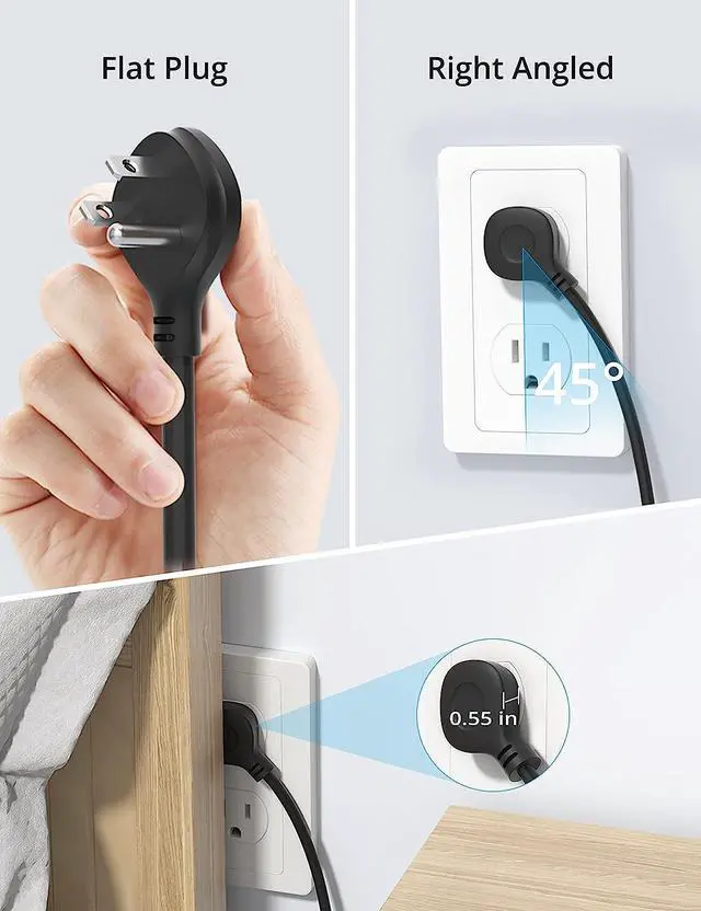 10ft Extension Cord Flat Plug: This surge protector power strip is made of 14AWG pure copper, and the 10-foot extension cord is heavy-duty and has a better current carrying capacity (15A). Angled flat plug eliminates awkward cords from cluttering indoor décor, and doesnt block the bottom receptacle