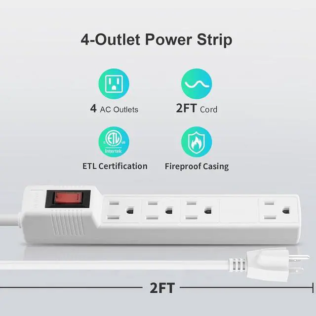 Outlets Power Strip: 2-pack 4 outlet power strip 4 outlets including one transformer outlet which accommodate transformer plugs without blocking adjoining outlets. 2 feet 14AWG extension cords (1875W/15A), surge protector (90 Joules) with overload protection to protect your electronic devices from overload, short circuits, power spikes, lightning strikes, or fluctuations perfect for your home, office, garage and anywhere multiple devices need power.